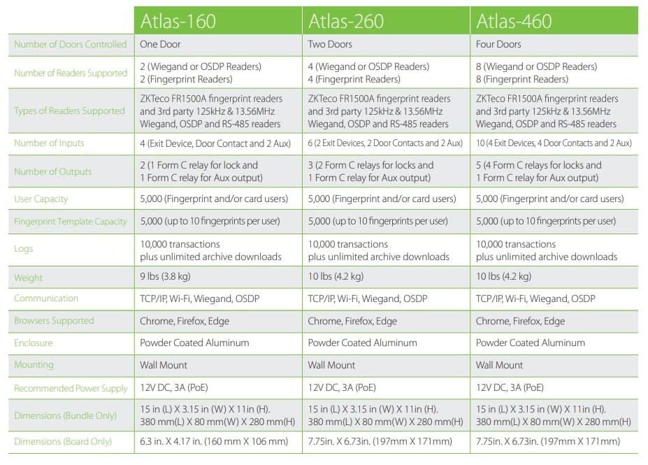 - Secure and convenient fingerprint access using ZKTeco’s industry-leading biometric technology (Biometric Atlas Series models only).