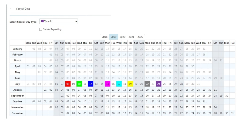 - Up to 8 types of holidays (special days) with different color label and calendar layout makes holiday settings more intuitive