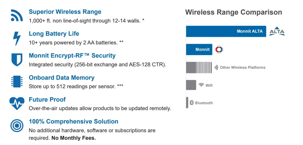 ALTA products use Monnit’s new Encrypt-RF® bank-level security, featuring a 256-bit exchange to establish a global unique key, and an AES-128 CTR for all data messages. So security is maintained at all communication points from the sensor to the gateway, the gateway to software, and back again.